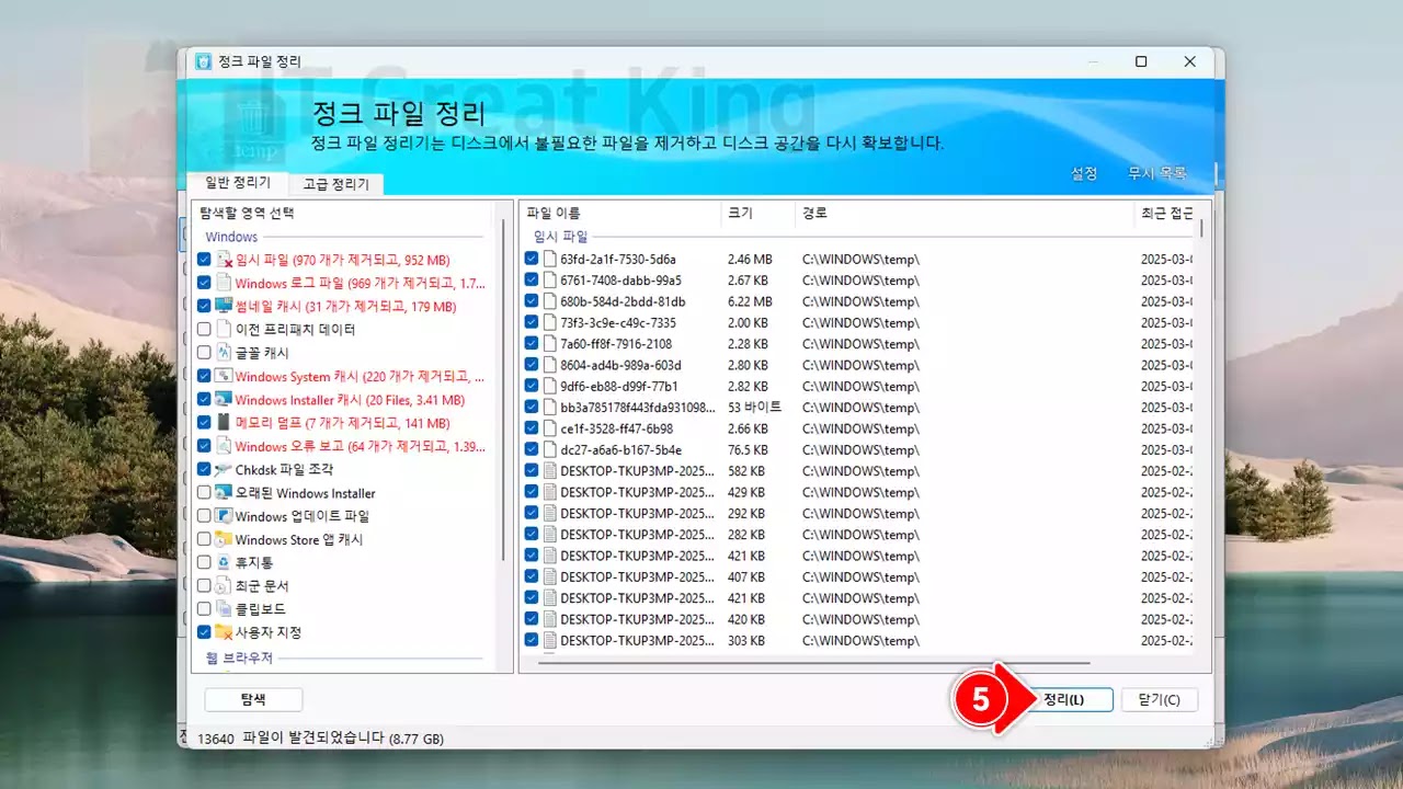 4 불필요한 정크 파일 스캔이 완료되면 우측 하단에 있는 정리 버튼을 클릭하여 검출된 정크 파일을 삭제합니다. 이 작업을 수행하면 임시 파일, 캐시 파일, 시스템 로그 등 불필요한 파일이 제거되어 디스크 공간이 확보되고, PC 성능이 향상됩니다. 주기적으로 정크 파일을 정리하면 저장 공간을 효율적으로 관리하고, 시스템 속도를 최적화하는 데 도움이 됩니다.